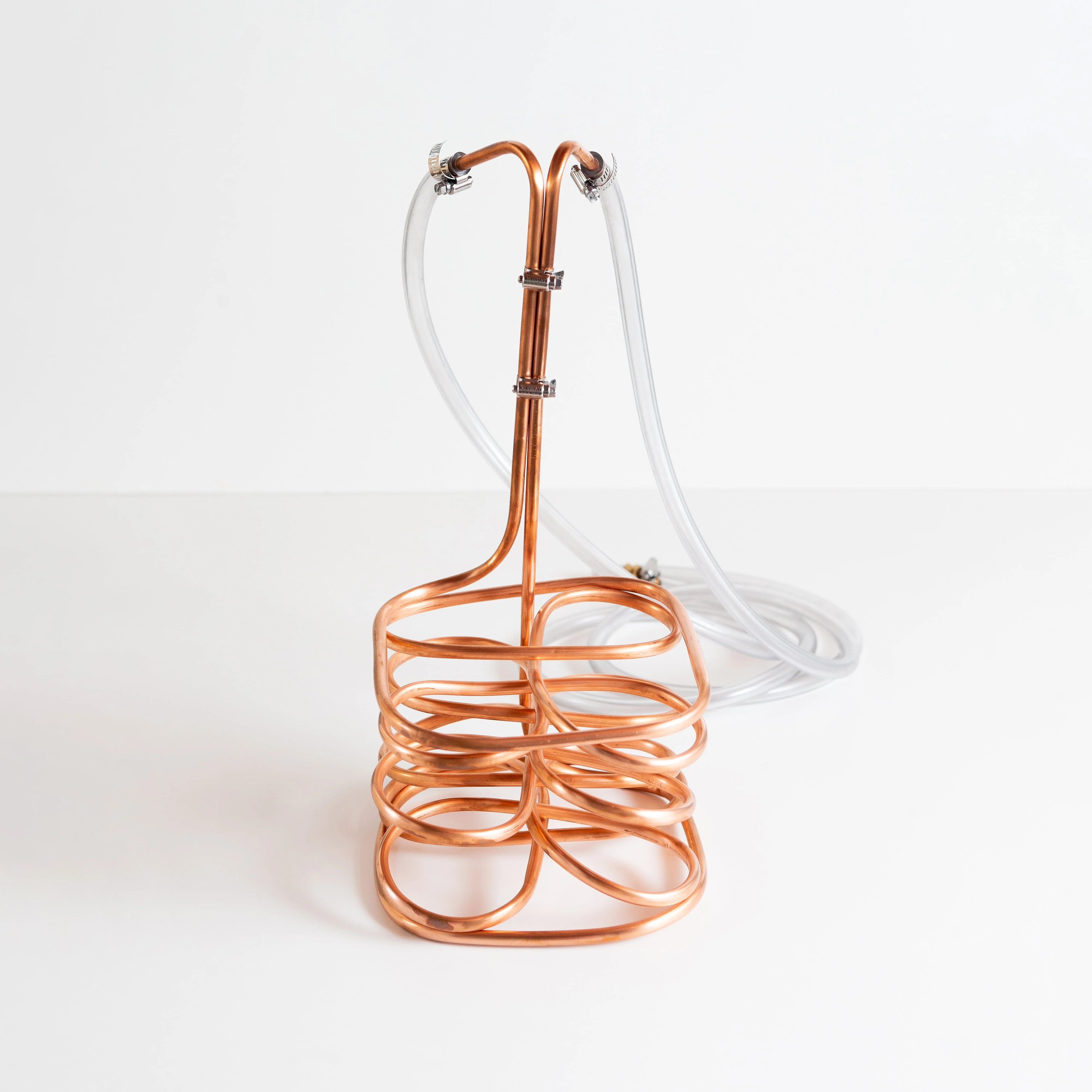 The chiller is constructed from 25 feet of 3/8-inch copper tubing, chosen for its excellent thermal conductivity and durability. It is well suited for use with 20 to 32 quart kettles and comes pre-assembled with a garden hose adapter and clamps for quick connection to a standard water source.